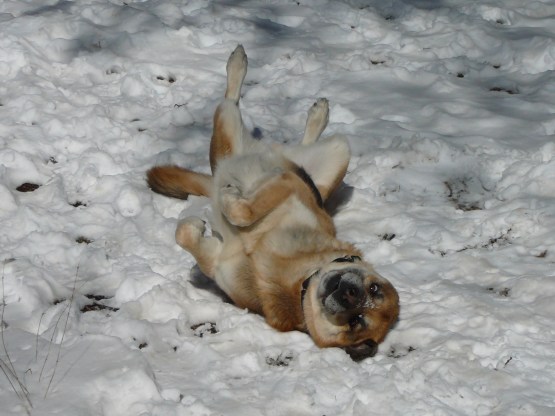 When Kali rolls on her back like that outdoors it’s usually because she smelled something dead or otherwise disgusting. In the snow tho’ maybe not so much.