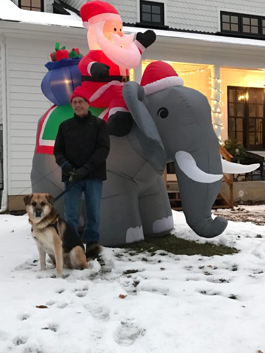 Yes! That elephant and an average chimney do pose a rather obvious problem. Ray’s happy because he knows that if he just goes along with our weird ways, he is likely to get treats! I am happy because it makes no sense to me to be unhappy. 🙂