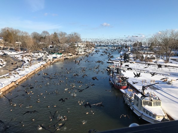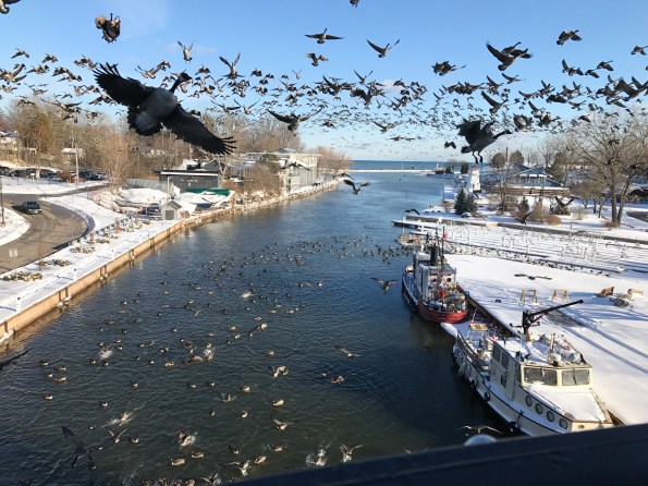 Our town is on Lake Ontario and has a small harbour created many years ago around an estuary, so we naturally have our local Canada Geese who spend much of their time sitting in the water and (seemingly) meditating. I would guess that when we cross over the river, which overlooks the harbour, we can usually see perhaps a 40-50 geese below us.