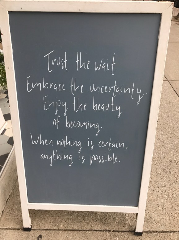 The first thing to cross my mind was “What a beautiful and positive response to an unknown.” Uncertain times tend to be reflected by negativity, and yet here was a statement that the same circumstances could just as easily have a positive outcome (in my mind set).
