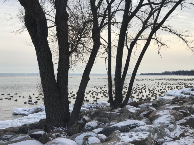 Note: The lake is flat, so those dark lines in the distance are not waves … but more and more Canada Geese!