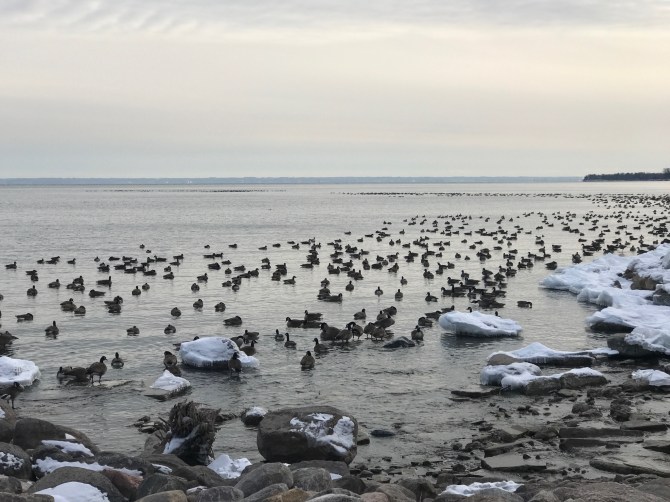Note: The lake is flat, so those dark lines in the distance are not waves … but more and more Canada Geese!